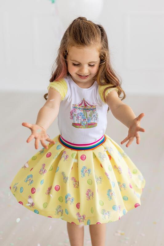 Прекрасна блузка с принт балони и еднорози, ръчно декорирани с пъстри кристалчета. Акцент са ръкавите , изработени от плисиран тюл с бляскав ефект. Комбинирайте с пола от същата серия. Състав: 90% памук , 10% еластан