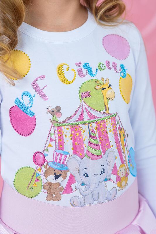 Прекрасна блузка с принт на тема цирк , любими герои , посипани с кристалчета в пъстри цветове. Комбинирайте с пола и аксесоари от същата серия . Изработена от : 90% памук , 10% еластан