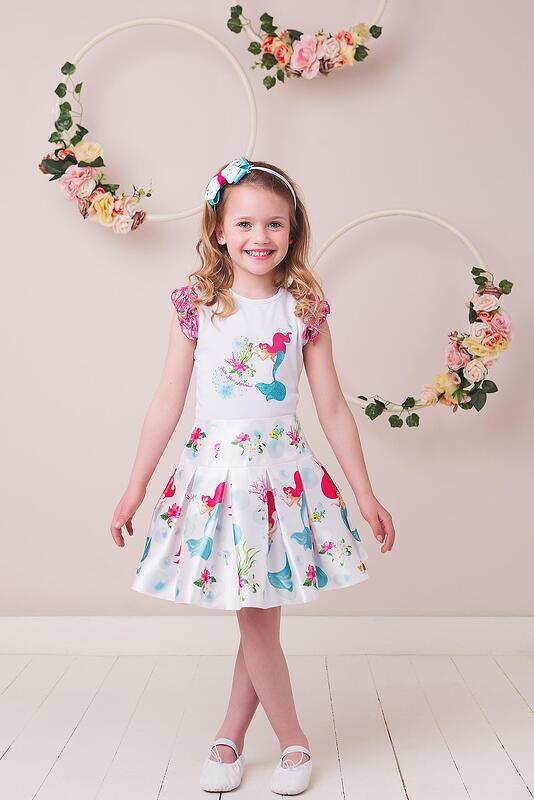 Прекрасна блузка от серията с русалки. Изработена от меко трико и накъдрени ръкавчета за принцеска визия. Принта е посипан с кристалчета в пъстри цветове. Комбинирайте с пола и аксесоари от същата серия. Изработена от 90% памук и 10% еластан.
