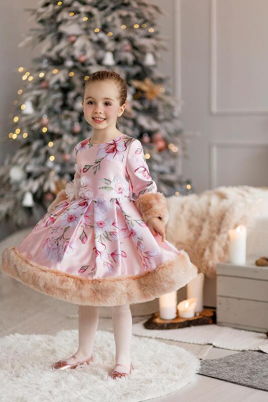 Приказна рокля в нежни цветове с магнолии, ръчна декорация с кристалчета и 3Д цветя в горната част . Ръкавите и подгъва са изработени от висококачествен еко косъм , който може да се сваля. Комбинирайте с аксесоари от същата серия. Изработена от: 100% полиетсер отвън и 100% памук отвътре