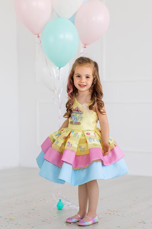 Прекрасна рокля в жълт цвят с балони и еднорози в долната част и въртележка в горната. Ръчна декорация с многоцветни камъчета и панделка от органза в млечно розов цвят.