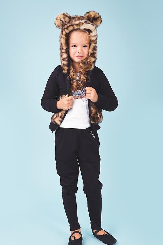 Страхотен спортен комплект в черно с тигров еко косъм на качулката и джобчетата. Долната част е с ластик и пада свободно.